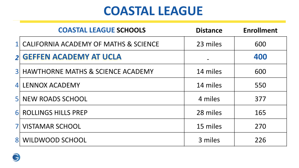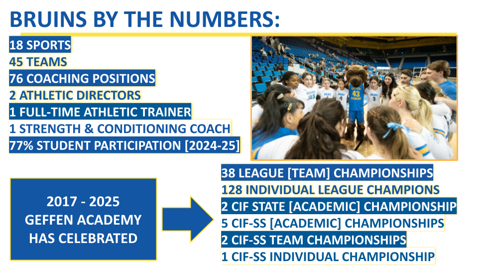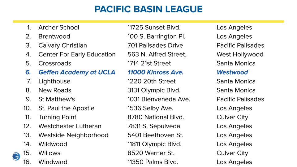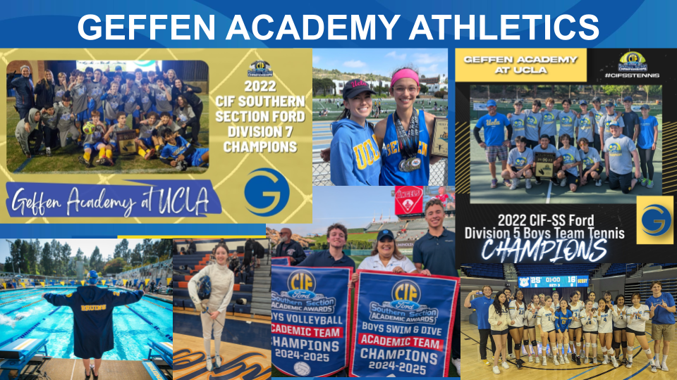 Situated in Westwood, the school has approximately 620 students and is embedded in the fabric of the Bruin Community. Geffen Academy has a rigorous academic program, and the athletic program is a dynamic, integral part of a student’s educational experience. We have two separate but concurrent competitive athletic programs. For our middle school, we compete in the Pacific Basin League, against 15 local independent schools, and our high school team competes in the Coastal League under the governance of CIF Southern Section. |