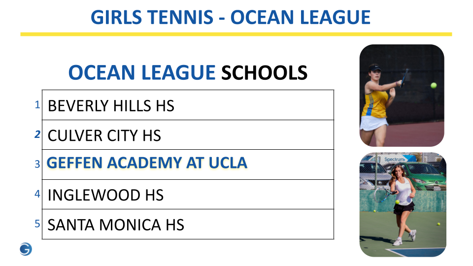 In the sport of Girls’ Tennis, Geffen Academy at UCLA cross-leagues into the Ocean League.